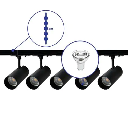 Bright Choice Set completo 1-Fase Rail 3 Metro Nero | incl. 5x Faretti + GU10 2700K 3W Dimmerabile + Tappo Di Chiusura, Connettore di Alimentazione e I-Connettore
