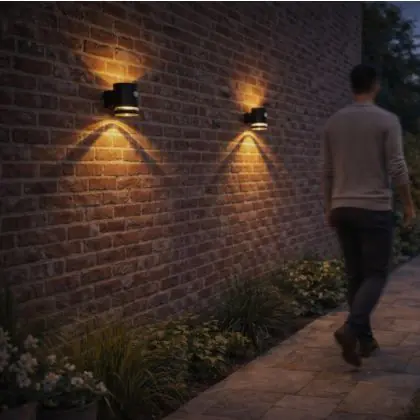 La D’Lite Solis Wall Light si distingue per la sua estetica contemporanea e la funzionalità intelligente. Si ricarica con la luce solare durante il giorno e si attiva automaticamente al rilevamento di movimento. L’illuminazione verso l’alto e verso il basso non solo migliora la visibilità, ma aggiunge anche un tocco decorativo alle pareti esterne.