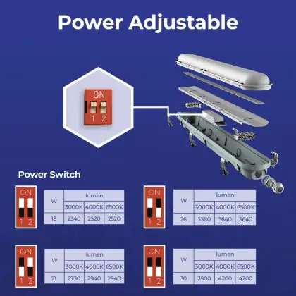 Descrizione Noxion Stagna LED Poseidon V3.0 19-33W 2340/4200lm - 830-865 CCT | 120cm - Cablaggio Entra/Esci (5x2.5mm2) - Emergenza 3H